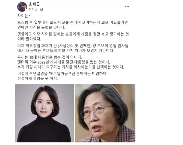 논란이 번지자 최 교수는 게시글을 고쳤다. "차이는?"이라는 표현 뒤에 "어제 하루종일 화제가 된 양 후보의 영입 인사로 내 눈에는 후보들의 지향 가치 차이가 보인다"는 내용을 덧붙였다.