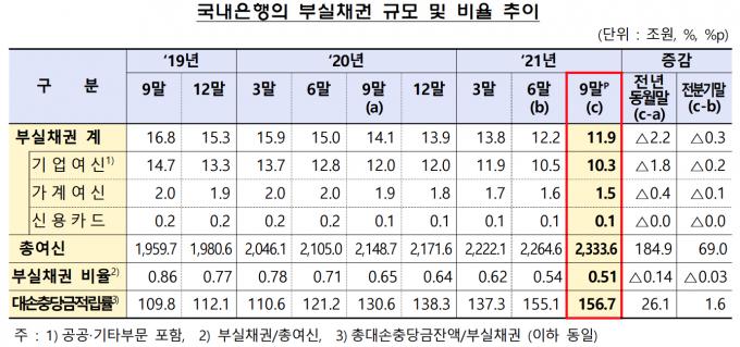 부문별로 보면 기업 여신의 부실채권 비율은 0.72%로 전 분기보다 0.04%포인트 낮아졌다.