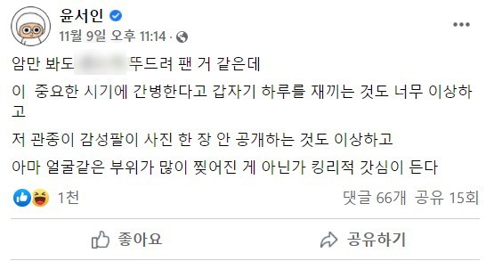 윤 씨는 이 후보의 부인 김혜경 씨가 지난 9일 자택에서 쓰러져 부상하자 같은날 자신의 페이스북에 "암만 봐도 팬 거 같다", "사진 한 장 안 공개하는 것도 이상하고, 아마 얼굴 같은 부위가 많이 찢어진 게 아닌가" 등 글을 올렸다.