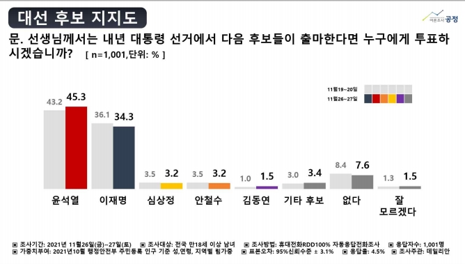 여론조사공정㈜이 이날 발표한 정례조사(26, 27일 실시)에 따르면 다자 가상 대결에서 국민의힘 윤석열 대선 후보는 45.3%, 이 후보는 34.3%를 기록했다. 지난주 조사와 비교해 윤 후보 지지율은 2.1%포인트(p) 올랐다. 반면 이 후보 지지율은 1.8%p 내렸다.