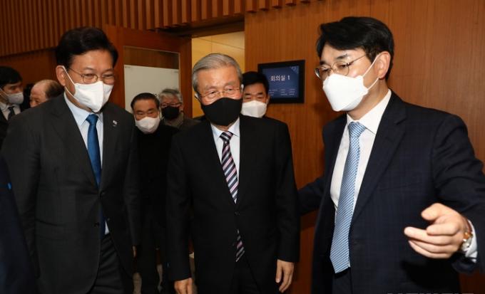 ▲ 국민의힘 김종인 전 비대위원장(가운데)이 1일 서울 광화문 교보빌딩에서 열린 더불어민주당 박용진 의원(오른쪽)의 출판기념회에 참석해 행사장으로 이동하고 있다. 왼쪽은 민주당 송영길 대표. [뉴시스]