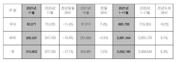 내수 6만2071대…11.4% 줄어 '반도체 대란'에 지난달 현대자동차의 판매량이 큰 폭으로 감소했다. 현대차는 올해 11월 국내 6만2071대, 해외 25만531대 등 전년 동월 대비 17.1% 감소한 31만2602대를 판매했다.