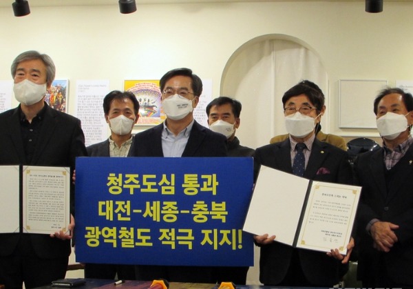 그는 충청권 광역철도 도심 통과 서명식에서 "청주 도심 통과로 인해 청주에서 세종, 대전으로 이동하는 시간이 대폭 줄어들 것"이라며 "당선되면 메가시티 건설을 위해 해당 사업을 가장 먼저 추진하겠다고 약속한다"고 말했다.