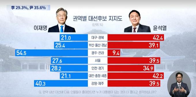 리서치앤리서치가 같은 날 공개한 여론조사(채널A 의뢰로 지난달 27~29일 전국 18세 이상 성인남녀 1008명 대상 실시)에서도 이 후보 호남 지지율은 51.1%로 50%대를 찍었다. 윤 후보는 10.4%를 얻었다.