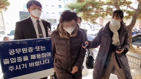 ▲ 국민의힘 윤석열 대선 후보의 장모 최은순 씨가 2일 변호인과 함께 재판을 받기 위해 의정부지법 7호법정으로 향하고 있다. [뉴시스]