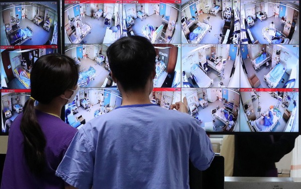 ▲ 지난달 22일 서울 중랑구 서울의료원 코로나19 종합상황실에서 의료진들이 병상 CCTV를 살펴보고 있다. [뉴시스]