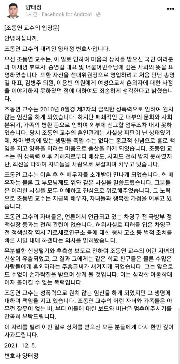 양 변호사는 "조 전 위원장(조 교수)은 2010년 8월 제3자의 끔찍한 성폭력으로 원치 않는 임신을 하게 되었지만 그 생명에 대해 책임을 지고 있다"며 "폐쇄적인 군 내부 문화와 사회 분위기, 가족의 병환 등으로 인하여 외부에 신고할 엄두조차 내지 못했다"고 강조했다. 그러면서 "조 전 위원장의 어린 자녀와 가족들은 아무런 잘못이 없는 바 부디 이들에 대한 보도와 비난은 멈추어주시기를 간곡히 부탁드린다"고 호소했다.