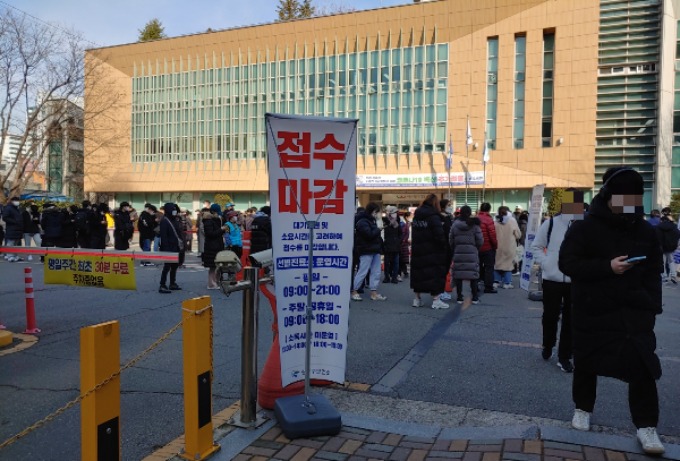 ▲ 6일 서울 강동구보건소 앞에 마련된 선별진료소에 접수 마감을 알리는 안내판이 설치돼있다. [김명일 기자]