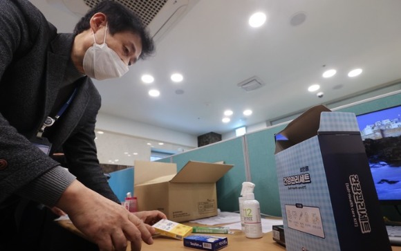 ▲지난 달 18일 오후 서울 영등포구의 한 코로나19 생활치료센터 상황실에서 관계자가 재택치료 대상자들에게 보급되는 '건강관리세트' 키트를 선보이고 있다. [뉴시스]