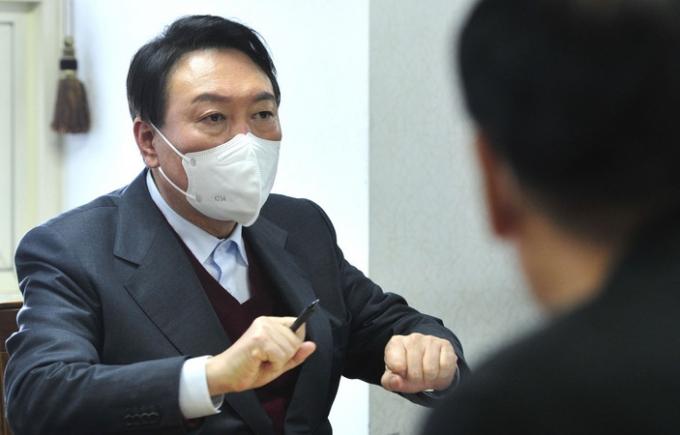 윤석열 대선 후보는 8일 일명 '비니좌' 노 위원장 거취에 대해 "가정적으로 답하기는 어렵다"면서도 "선대위에서 (영입 철회를) 검토하고 있다고 들었다"고 밝혔다. 재경 광주전남향우회 간담회 후 기자들과 만나서다.