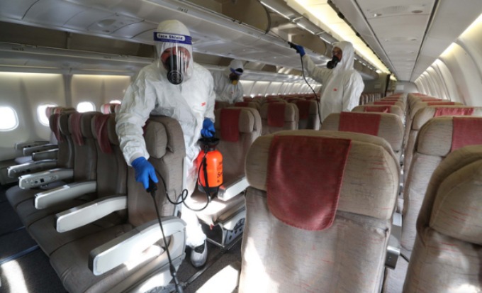 ▲ 9일 인천 중구 아시아나항공 격납고 내에 주기된 한 비행기 내에서 방역 요원들이 코로나19 예방을 위한 기내 소독 작업을 벌이고 있다. [뉴시스]
