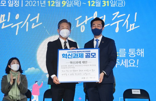 ▲ 더불어민주당 이재명 대선 후보(가운데)가 9일 서울 마포구 가온 스테이지에서 열린 정당혁신추진위원회 출범식에서 혁신과제 1호 공모를 전달받고 있다. [뉴시스]