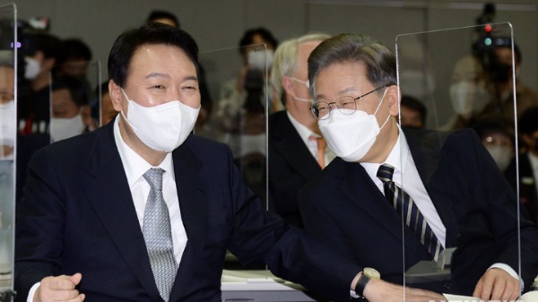 이 후보는 "최근 종전선언을 두고 논란이 많은데, 종전선언을 넘어 평화협정으로 가야 한다"며 '시기상조'를 이유로 종전선언을 반대한 윤 후보에게 재검토를 요청했다.