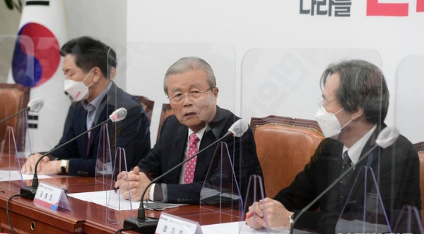 ▲ 국민의힘 김종인 총괄 선거대책위원장(가운데)이 10일 오전 서울 여의도 국회에서 열린 코로나위기대응위원회 1차 회의에서 발언하고 있다. [뉴시스]