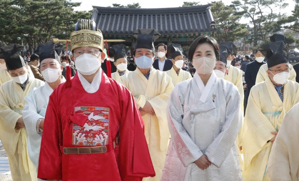▲ 더불어민주당 이재명 대선 후보(앞줄 왼쪽)가 배우자 김혜경 씨(앞줄 오른쪽)와 10일 경북 경주시 표암재를 방문해 알묘를 지내고 있다. [뉴시스]