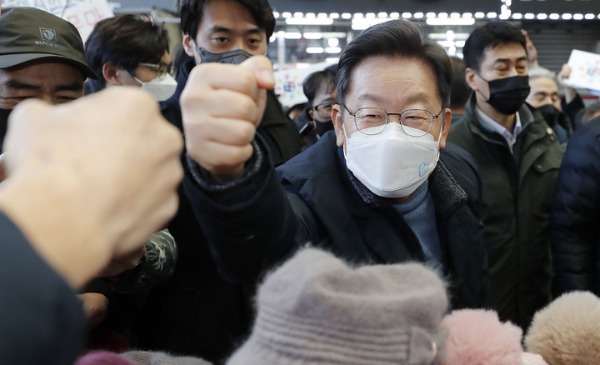 ▲ 더불어민주당 이재명 대선 후보가 지난 13일 경북 포항시 죽도시장을 방문해 시민들과 인사하고 있다. [뉴시스]