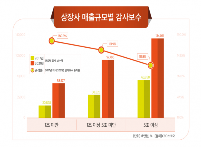 매출이 5조 원 이상인 89개 기업은 2017년부터 올해까지 감사보수가 111.8%(707억 원) 증가한 반면, 매출 1조 원 이상 5조 원 미만 172개 기업은 151.9%(590억 원), 매출 1조 미만 167개 기업은 180.3%(377억 원) 각각 증가했다. 감사보수 증가율이 100% 이상인 기업 비율도 매출 5조원 이상 그룹은 18.0%에 그친 반면, 매출 1조 원 이상 5조 원 미만 그룹과 매출 1조 미만 그룹은 각각 42%, 41%에 달했다.