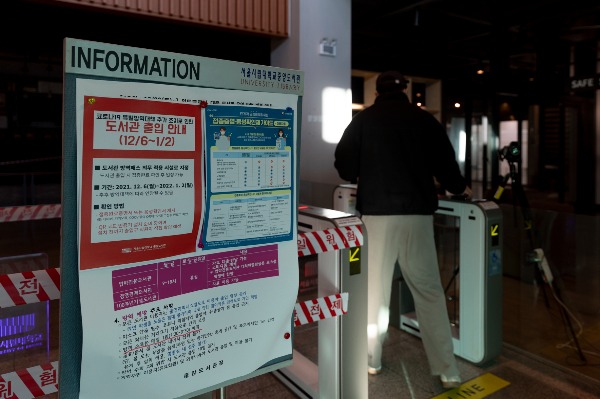▲ 방역패스(백신패스) 미확인 시 이용자와 운영자에게 과태료가 부과되기 시작한 지난 13일 서울시립대학교 중앙도서관에 '방역패스' 안내문이 붙어 있다. [문재원 기자]