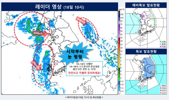 기상청은 이날 오전 10시 서울과 인천, 경기 광명·과천·안산·시흥·부천·김포·동두천·고양·양주·의정부·파주·수원·성남·안양·구리·남양주·군포·의왕·하남·용인·화성·광주, 강원 평창군평지·횡성·홍천군평지 등에 대설예비특보를 발표했다.