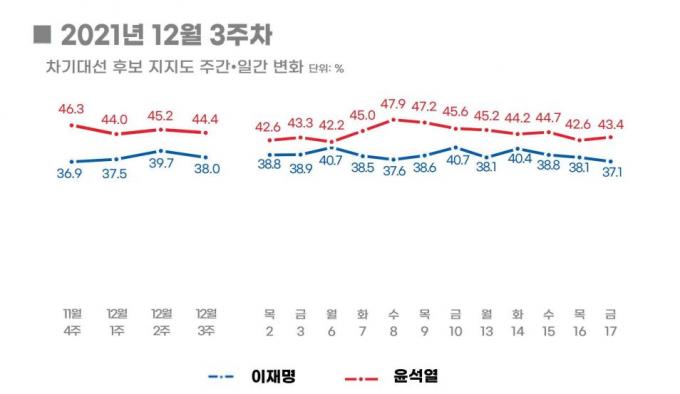 리얼미터가 이날 발표한 여론조사(오마이뉴스 의뢰로 12~17일 전국 만 18세 이상 남녀 3043명 대상 실시) 결과 차기 대선후보 지지도(4자 대결)에서 윤 후보 지지율은 44.4%, 이 후보가 38.0%로 나타났다. 전주 (12월 2주) 대비 윤 후보는 0.8%포인트(p), 이 후보는 1.7%p 하락했다. 두 후보의 격차는 6.4%p로 여전히 오차범위(95% 신뢰 수준에 ±1.8%p) 밖이다. 11월 4주차부터 이 후보는 윤 후보와 지지율 격차를 9.6%p에서, 12월 1주 6.5%p, 12월 2주 5.5%p로 점차 좁혀가는 추세였다.