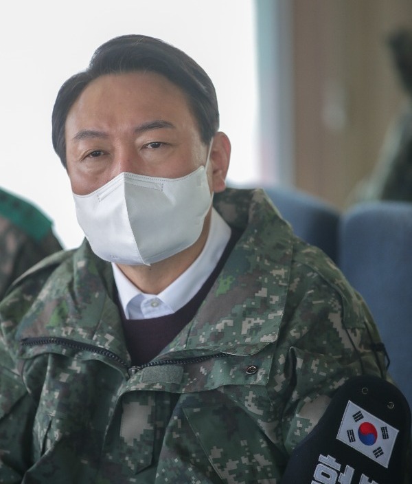 ▲ 국민의힘 윤석열 대선 후보가 20일 오전 육군 3사단 백골 OP부대를 찾아 관계자의 설명을 듣고 있다. [윤 후보 선대위 제공]