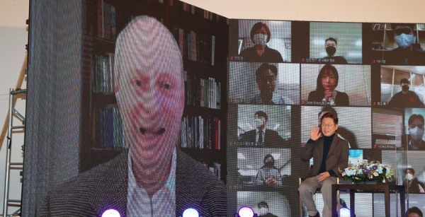 ▲ 더불어민주당 이재명 대선 후보(오른쪽)가 21일 서울 중구 정동1928 아트센터에서 마이클 센델 하버드대학교 교수와 '대전환의 시대, 대한민국은 어떻게 공정의 날개로 비상할 것인가'의 주제로 화상 대담을 하고 있다. [뉴시스]