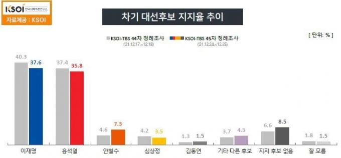 한국사회여론연구소(KSOI)가 27일 발표한 여론조사에서 이 후보는 37.6%, 윤 후보는 35.8%를 기록했다.