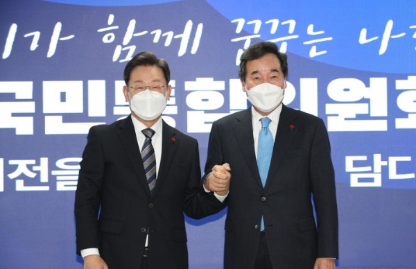 ▲ 더불어민주당 이재명 대선 후보(왼쪽)와 이낙연 전 대표가 27일 오전 서울 여의도 당사에서 열린 국가비전·국민통합위원회 출범식에서 손을 잡고 사진 촬영을 하고 있다. [뉴시스]