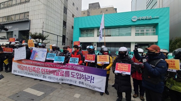 배달 노동자 조합 라이더유니온은 28일 서울 강남구 배민라이더스 남부센터 앞에서 기자회견을 열고 "민주노총 서비스연맹이 우아한청년들과 맺은 임금교섭 잠정합의안은 기본 배달료 동결, 픽업 무료노동 문제를 반영하지 못했다"며 "온전한 실거리 요금제와 안전배달료 도입을 논의해야 한다"고 밝혔다.