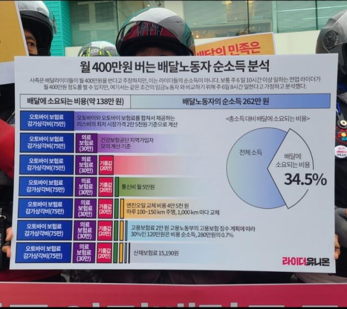 이에 라이더유니온은 업무에 들어가는 비용, 노동시간, 사회보험료, 안전, 사고 은퇴 실직에 대비한 비용 등 5가지 기준에 맞춰 배달료를 정해야 한다는 입장이다.