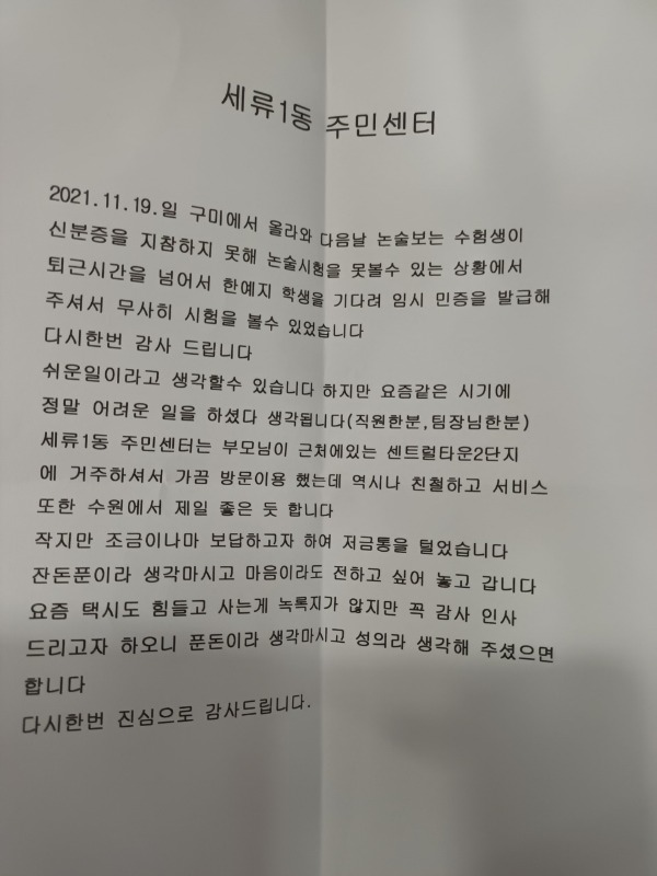 기차에서 내린 한 양은 정신없이 세류1동행정복지센터를 찾아 오후 7시쯤 도착했다. 주무관은 곧바로 한 양에게 주민등록증을 재발급해줬고, 한 양은 다음날 무사히 논술시험을 치를 수 있었다.