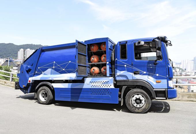이날 공개된 영상에 등장하는 수소청소트럭은 연료전지 시스템과 수소탱크 등을 기존의 청소트럭에 맞게 설계를 최적화한 모델로서 2021년 1월부터 경상남도 창원시의 환경 미화 작업에 투입되어 실증 운행을 진행해왔다.