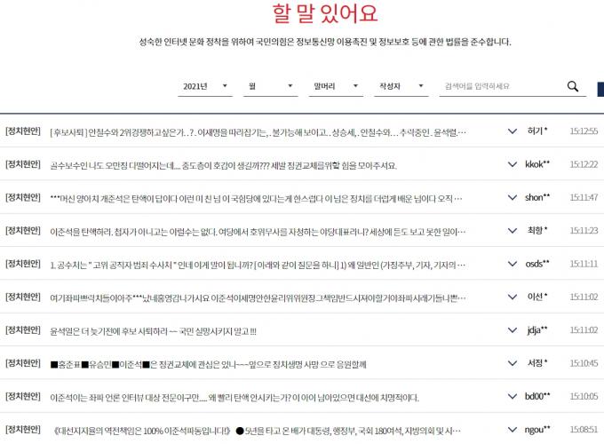 윤 후보와 이 대표의 충돌로 적전분열이 깊어지면서 당 홈페이지 '할말 있어요' 게시판은 항의, 성토의 글로 들끓고 있다. '이준석 사퇴론' '후보교체론'을 제기하는 글이 매일 수백건씩 올라온다.