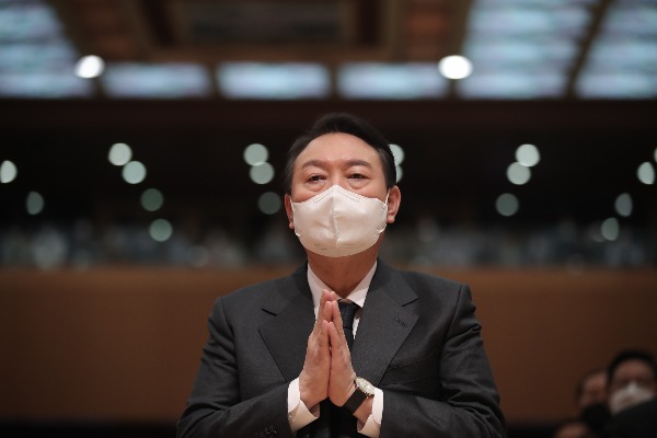 ▲ 국민의힘 윤석열 대선 후보가 31일 오전 충북 단양 구인사에서 진행된 상월원각대조사 탄신 110주년 봉축법회에서 합장하고 있다. [윤 후보 선대위 제공]