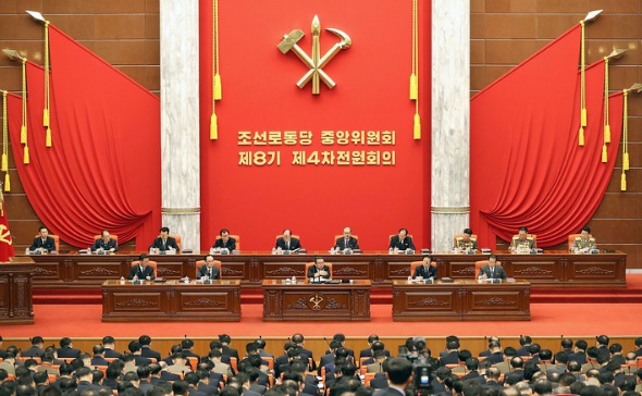 ▲ 김정은 북한 국무위원장(가운데)이 지난해 12월27일 평양에서 열린 노동당 중앙위원회 제8기 제4차 전원회의를 주재하고 있다. [뉴시스]