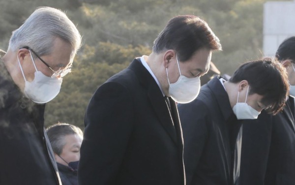 ▲ 김종인 국민의힘 선대위 총괄선대위원장(왼쪽부터), 윤석열 대선후보, 이준석 대표가 1일 오전 서울 동작구 국립서울현충원을 찾아 참배하고 있다. [뉴시스]