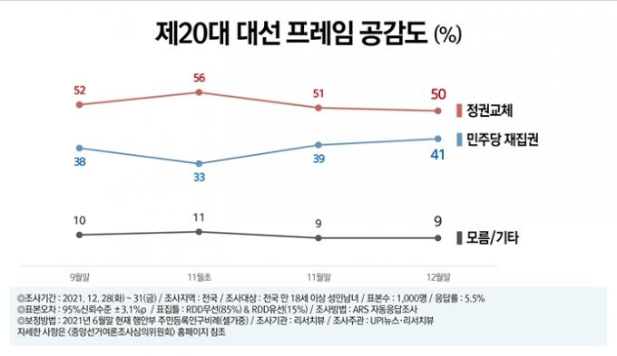 리서치뷰와 UPI뉴스가 공동으로 지난해 12월 28~31일 전국 만 18세 이상 성인 1000명을 대상으로 여론조사를 실시해 2일 발표한 결과에 따르면 정권교체 응답은 50%, 재집권 응답은 41%를 기록했다. 격차는 9%포인트(p)로, 오차범위(95% 신뢰수준에 ±3.1%p) 밖이다.
