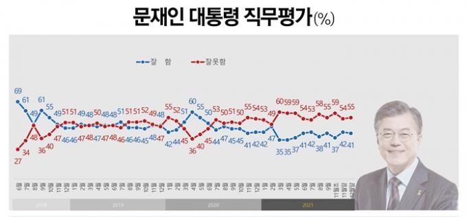 문재인 대통령 직무수행에 대한 긍정 평가는 41%로 조사됐다. 부정 평가는 55%였다.