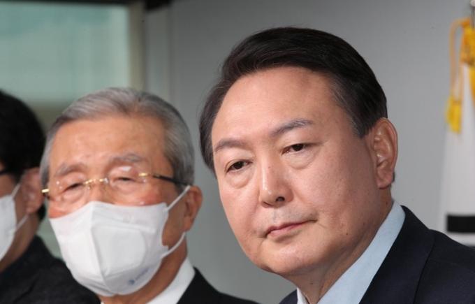 ▲ 국민의힘 윤석열 대선 후보(오른쪽)와 김종인 총괄선대위원장이 2일 오전 서울 여의도 당사에서 정책공약을 발표한 뒤 취재진 질문을 받고 있다. [뉴시스]