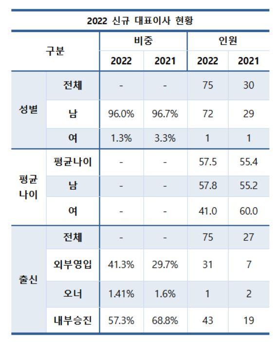 외부 영입 대표의 비중도 대폭 상승했다. 75명의 신규 대표 중 내부 출신은 43명으로 57.3%였고, 외부 영입 대표이사들은 41.3%인 31명으로 작년(29.7%) 보다 11.6%포인트 증가했다.