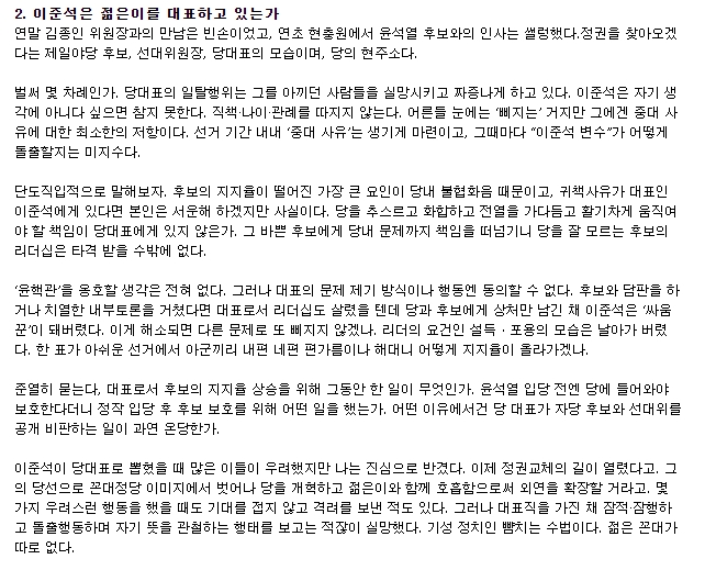 그는 "(윤석열)후보의 지지율이 떨어진 가장 큰 요인이 당내 불협화음 때문이고 귀책사유가 대표인 이준석에게 있다면 본인은 서운해 하겠지만 사실"이라고 적시했다. 이어 "당을 추스를 책임이 당대표에게 있지 않은가"라고 반문했다. 그러면서 "그 바쁜 후보에게 당내 문제까지 책임을 떠넘기니 당을 잘 모르는 후보의 리더십은 타격 받을 수밖에 없다"라고 강조했다.