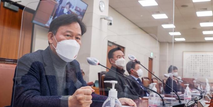 ▲국민의힘 윤한홍 의원(왼쪽)이 지난달 23일 서울 여의도 국회에서 열린 법사위 전체회의에서 발언하고 있다. [뉴시스]