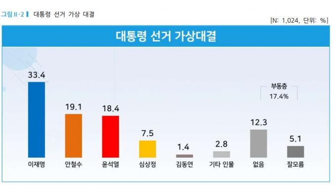 안 후보 지지세는 20대와 중도층에서 두드러졌다. 안 후보는 20대에서 23.6%, 중도층에서 23.8%를 얻었다. 20대에서 15.1%를 기록한 윤 후보를 8.5%p 앞섰다. 선두인 이 후보의 20대(26.4%), 중도층(28.9%)과도 별 차이 없다.