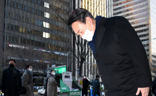 ▲ 국민의힘 윤석열 대선 후보가 6일 서울 여의도역 출구에서 출근하는 시민들에게 인사하고 있다. [뉴시스]
