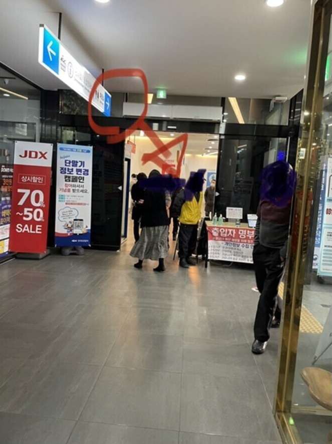 ▲지난 4일 경상북도 문경시 중부내륙고속도로에 위치한 문경휴게소 화장실 앞에서 노란 조끼를 입은 안내요원이 방역패스 확인을 하고 있다. [온라인 커뮤니티 캡처]