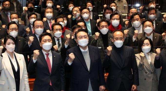 '이준석발 내분'으로 윤석열 후보 지지율이 급락하자 원내지도부가 비상조치에 나선 것으로 풀이된다. 당대표 사퇴 추진은 윤 후보와 이 대표의 정면충돌을 의미하는 것이어서 내홍이 절정으로 치닫는 양상이다. 두 사람이 돌아올 수 없는 다리를 건너는 셈이어서 파국이 불가피하다는 전망이 나온다.
