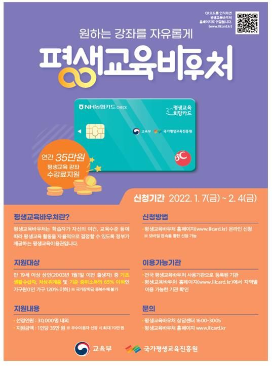 3만 명에 1인당 35만 원 지급 교육부와 국가평생교육진흥원이 7일부터 다음 달 4일까지 '2022년 평생교육이용권(평생교육바우처)' 신청을 받는다고 6일 밝혔다.