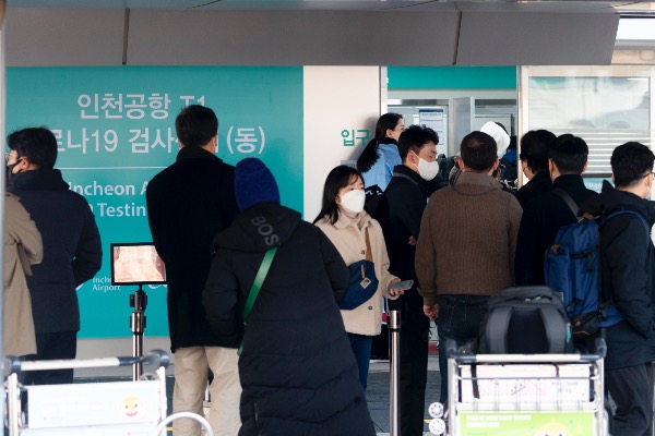 ▲ 누적 오미크론 감염자가 1318명으로 확인된 지난 3일 인천국제공항 제1터미널 코로나19 검사센터에서 검사 받으려는 이용객들이 줄 서 있다. [문재원 기자]