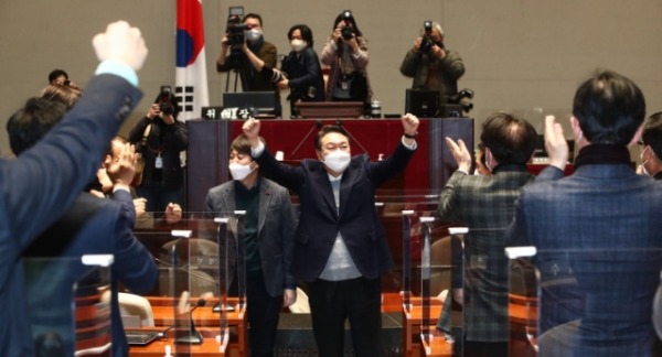 尹, 의총장 찾아 "모두 힘 합쳐 3월 대선 승리로 이끌자" 국민의힘 이준석 대표와 윤석열 대선 후보의 갈등 양상이 6일 오후 의원총회에서 극적으로 봉합됐다.