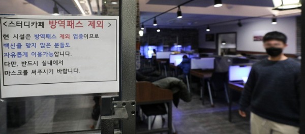 ▲ 지난 5일 서울 시내 한 스터디카페에 방역패스 제외 안내문이 붙어있다. [뉴시스]